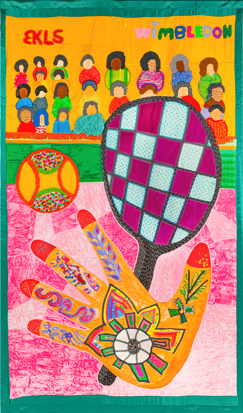This artwork is the first of a series of tapestries which celebrate the beauty of equality and diversity in tennis, recalling the icons of Wimbledon. Each panel has been designed combining elements from drawings by 60 young and old members of Katherine Low Settlement .